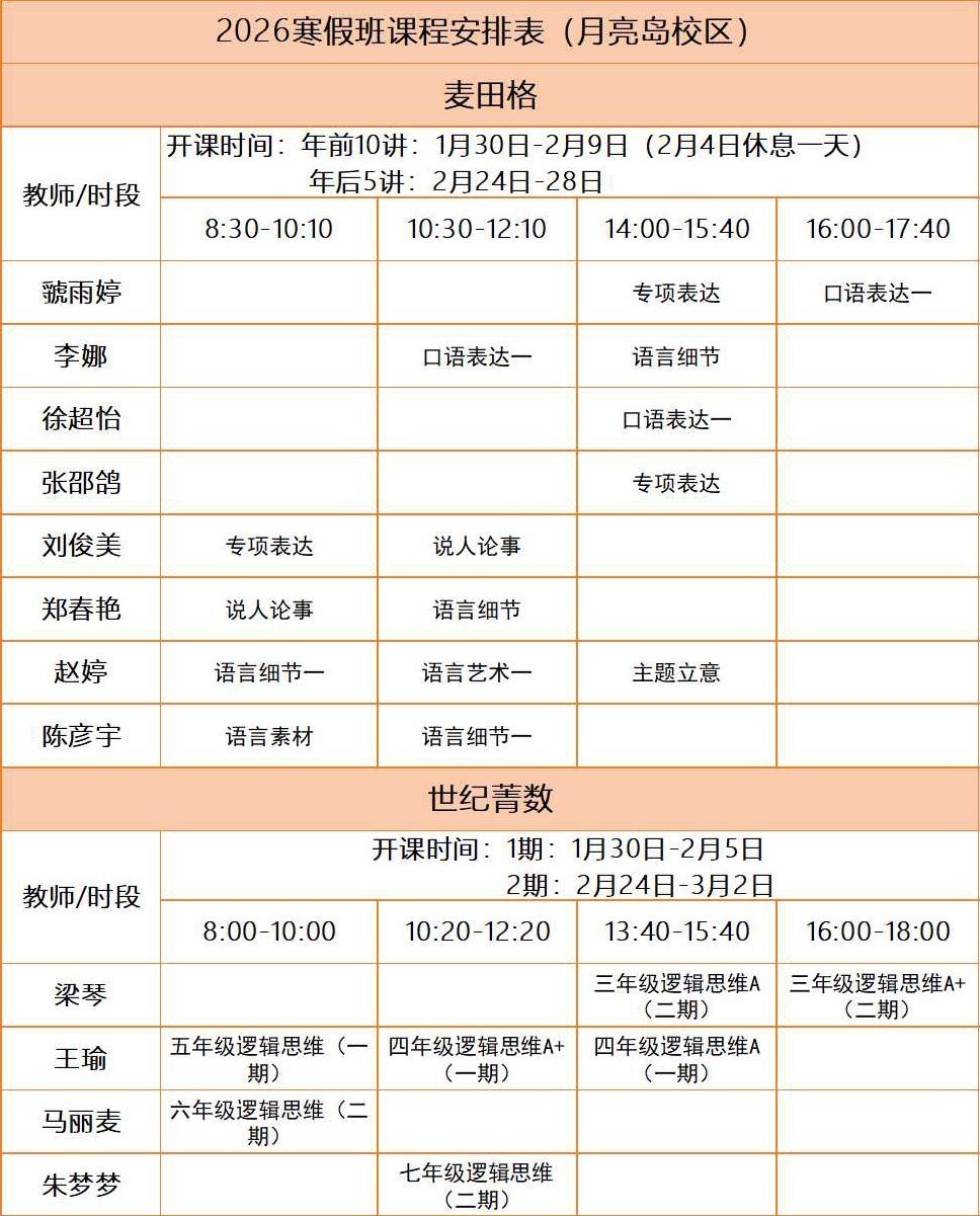麦田格2026年月亮岛校区寒假课表